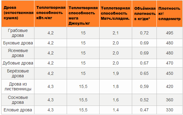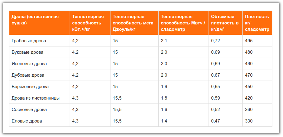 А, как известно, древесина разных пород имеет разную теплотворную способность. Посмотрите на представленную ниже таблицу теплоты сгорания дров: