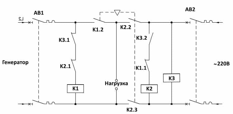 Данная схема АВР классическая и прекрасно работает, но при ее использовании необходимо учитывать коммутирующую мощность силовых контактов: если контакты рассчитаны на рабочий ток, например, 12 Ампер, то и нагрузку к АВР следует подключать не более 12 Ампер.