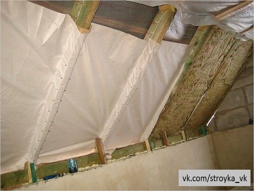 Пригвоздить контрольной рейкой к каждой стропилине, чтобы материал не повредился ветром, который будет немного гулять там. Некоторые строители используют обычный рубероид, но его эффективность крайне сомнительная, поскольку при перепаде температуры он может трескаться, быстро приходит в негодность.