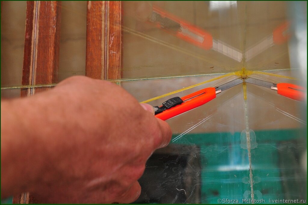 По шаблону вырезается новое стекло. Затем силиконовым герметиком нужно промазать и рёбра нового стекла, и поверхности стыков конструкции.