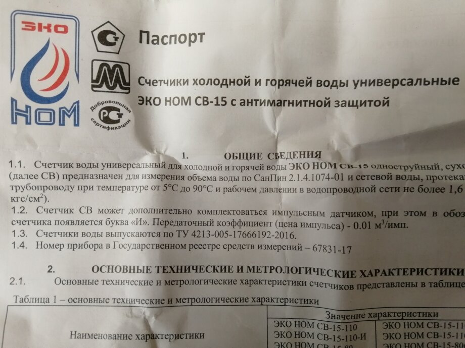 — Паспорт на водосчетчик представляет собой документ, в котором содержится информация о технических характеристиках счетчика, сроках его поверки, дате изготовления и ввода прибора в эксплуатацию.