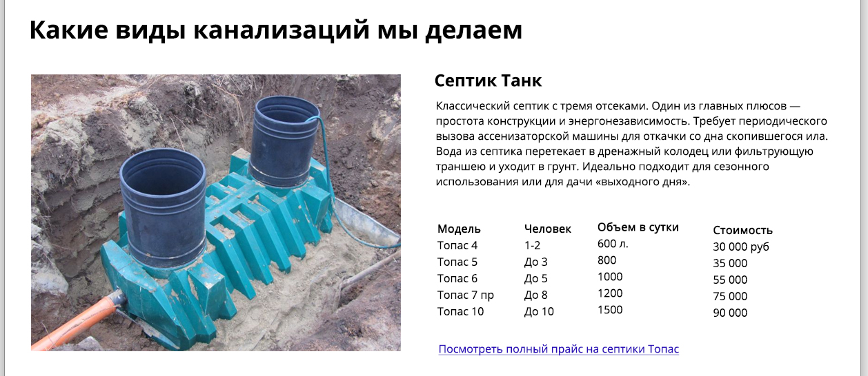 Самая высокая эффективность оборудования проявляется на песчаном грунте, поскольку именно здесь самый большой коэффициент фильтрации. Не смотря на то, что данное устройство обрабатывает небольшое количество бытовых сточных вод, оно считается наиболее качественным. Чаще всего его располагают под землей. В состав септика входят две либо четыре камеры. Очистка происходит путем разрушения органических веществ бактериями.