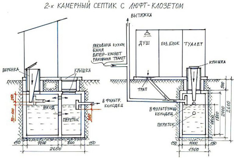 Но есть простое решение такой проблемы. Можно просто сделать еще одну яму рядом с первой и соединить обе переливной трубой. В этом случае общий объем накопителя увеличится в несколько раз, а сама система будет представлять собой уже своеобразный септик.