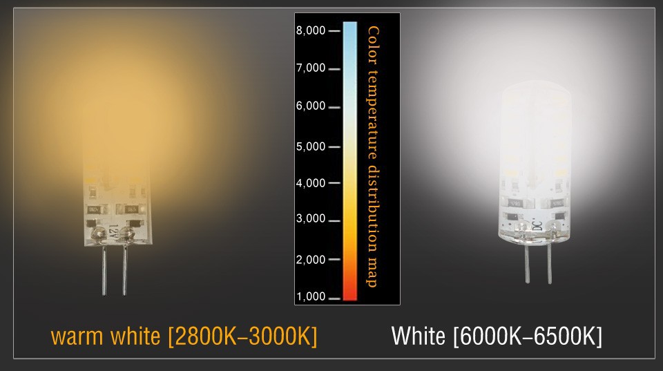 Они бывают в цвете 2000K как мягкий теплый белый, в 4000K как нейтральный чистый белый свет и до 6000K как холодный голубовато-белый свет.