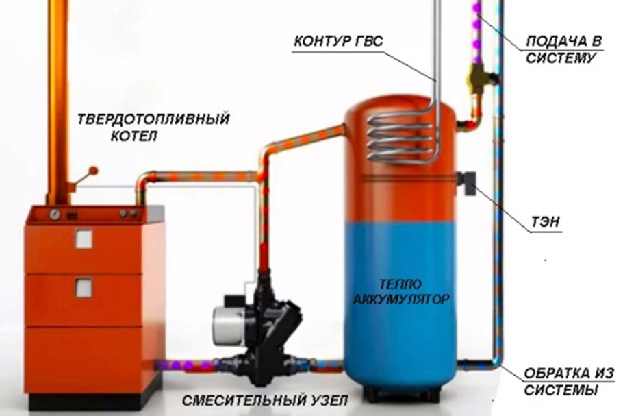 Фото 1. Схема отопления с использованием твердотопливного котла. Обратка обозначена синим цветом.