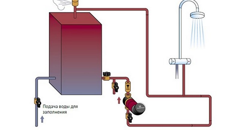 Приемлемым решением в данной ситуации является подсоединение дополнительного водонагревающего устройства — бойлера. Он устанавливается рядом с котлом специальным образом, чтобы теплоноситель, пройдя по всем приборам системы, попал в него, а затем в котёл.