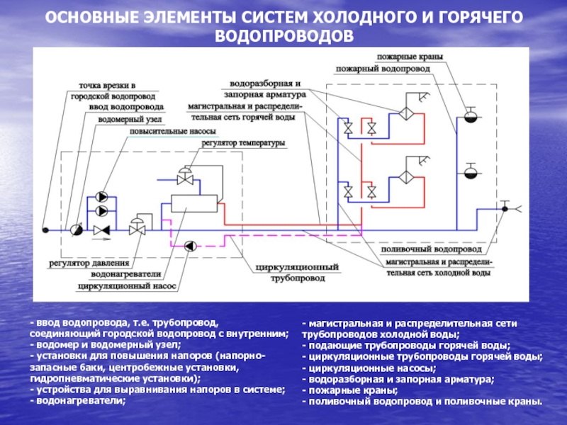 Система водоснабжения Состоит из водопровода, водораспределительной трубы, необходимые соединительные трубы, фитинги, регулирующие клапаны и все принадлежности в или рядом со зданием или помещением.