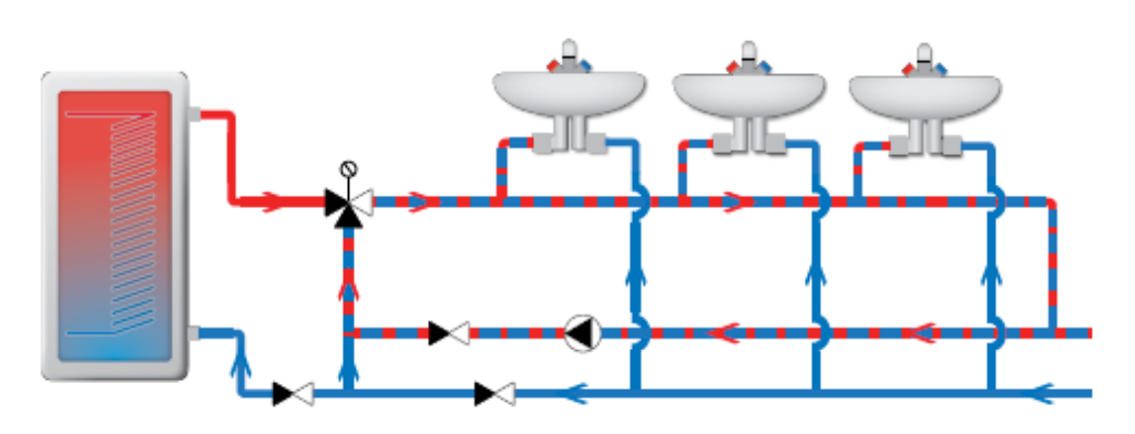 При монтаже системы без циркулярного насоса соблюдается правило: подача возможна если есть уклон от или к котлу. Теплоноситель с более высокой температурой через подвод (наклон от котла к отопительному прибору) поступает в радиатор и прогревает его, а затем выходит через обратку (наклон от радиатора к котлу), но с уже меньшей температурой. Опытные мастера нередко прибегают к замене рециркуляционного насосного кольца на систему 3-х или 4-х ходовых смесителей.