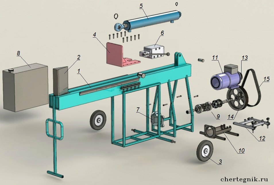 Более производительными являются колуны с двигателями. Для установки понадобится электродвигатель, бачок для масла, насос, гидроцилиндр с толкателем и блок управления.
