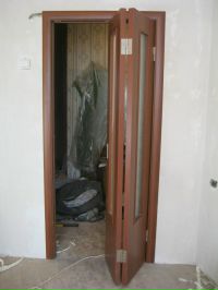Монтаж складной двери, несмотря на визуальную сложность конструкции, также является простым. Отдельные ламели «гармошки» или «книжки» соединены друг с другом подвижными шарнирами, а одна из крайних полос зафиксирована неподвижно.