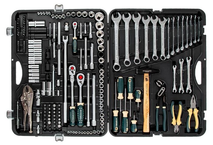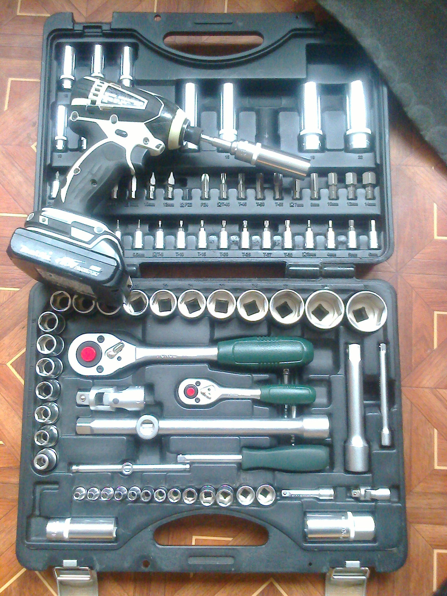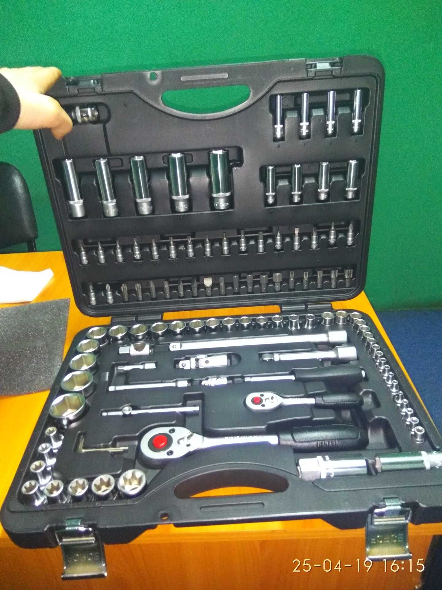 Отменный набор железок, позволяет прорываться на ремонтах и обслуживании автомобиля и не только. Пользуюсь больше 10-ти лет, перечинено, разобрано и собрано бессчетное количество всякого, от авто до мебели. За годы не сломалось ничего. Под свои задачи купил набор переходников для торцевых головок с квадрата 1/2 и 1/4 на шестигранник 1/4 (6,35) под ударный шуруповерт, переходники помещается в выемку под ручками трещеток.
