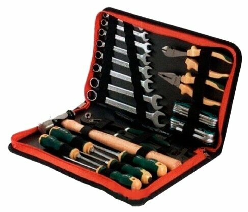 Фирменный кейс изготовлен из высококлассного пластика. Сами инструменты делаются с применением хромованадиевых сталей. Комплект включает также реверсивную трещотку ручного типа с фиксатором. Величина стандартной тары составляет 450Х340Х90 мм. Общая масса набора чуть больше 7,2 кг.