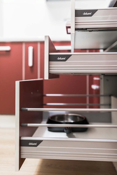 - Фурнитура Blum настолько удобная и функциональная, что однозначно станет помощником хозяйки на кухне. А еще не причинит отдельных хлопот по уходу за мебелью, так как основные фасады и фурнитура может быть съемной, что позволит с легкостью проводить гигиеническую уборку на кухне или даже мыть петли и подъемники blum в посудомоечной машине.