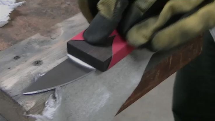 Александр выбрал подходящее полотно мехпилы из быстрореза (HSS made in USSR). Я обрезал лишнее и на наждаке сделал контур будущего ножа, затем обработал заготовку крацовкой — вращающейся стальной щеткой, придав ей благородный черный блеск, и окрасил клинковую часть с двух сторон синим широким маркером, предназначенным для складских работ.