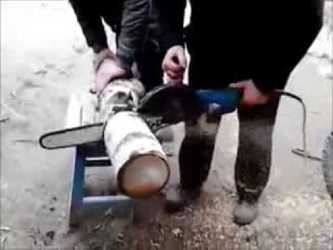 А в этот же момент пила уже движется в сторону ноги… На пиле, конечно, есть защита, но это экстремально неправильно. Как говорится, не пили сук, на котором сидишь.