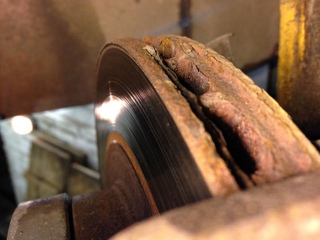 Повреждение ржавчиной: Эта проблема очень часто встречается в соляном поясе. Тормозные диски и другие детали имеют тенденцию к ржавчине, когда автомобиль в течение некоторого времени припаркован снаружи. Дорожная соль ускоряет процесс коррозии, и мало что можно сделать, чтобы остановить его. Например, посмотрите это фото: роторы в этой машине заржавели, когда она была припаркована. Только примерно половина рабочей поверхности тормозного диска имеет следы контакта с тормозной колодкой. Этот диск не соответствует требованиям инспекции производителя и должен быть восстановлен или заменен.