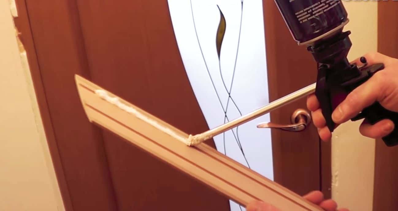Универсальный материал, который можно покрасить в необходимый цвет. Если дверная коробка установлена ровно, без какого-либо искривления, тогда наличники сажают на «жидкие гвозди», если же нет, то на гвозди без шляпок.