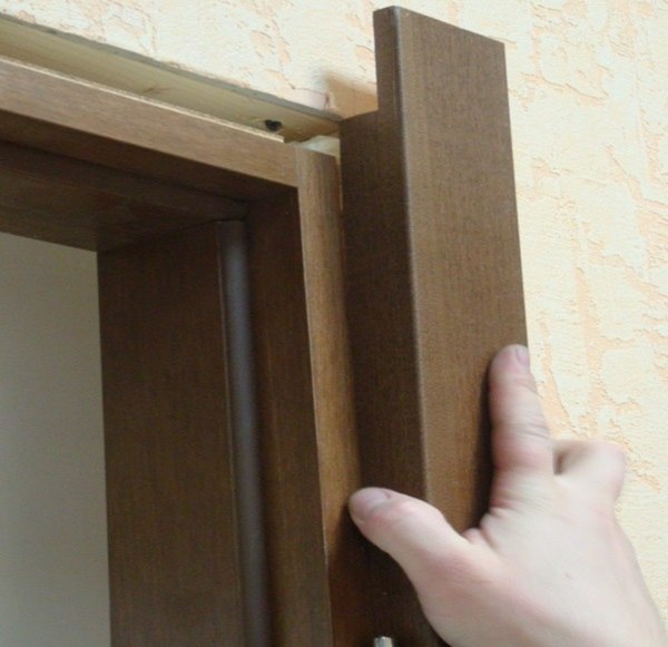 Длина выступа гвоздей остается где-то около 5 мм, после чего приставляются наличники к коробке. В месте, где находится гвоздь, на наличник прикладывают деревянный брусок, предварительно обернутый в ткань и аккуратно молотком сажается планка.