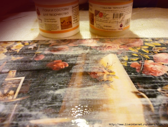 Его достаточно взять 40 граммов, добавить кипящую воду и выдержать. В результате должна получиться смесь, имеющая консистенцию жидкого йогурта. На обработанную методом декупажа поверхность наносится слой блестящего лака и высушивается. После этого широкой кистью наносится толстый слой декстрина. Сохнет он около 30 минут без фена.