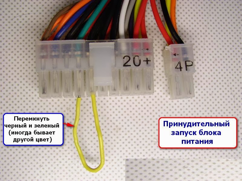 Но это еще не все. В штатном режиме блок питания не подает энергию, пока его об этом не попросить. Для этого нужно замкнуть в большом молексе зеленый и черный провода. В компьютере за нас это делает электроника материнской платы. поэтому либо выдираем зеленый и черный провода из молекса материнской платы и скручиваем между собой, либо делаем жучок-перемычку между контактами (я так и сделал).