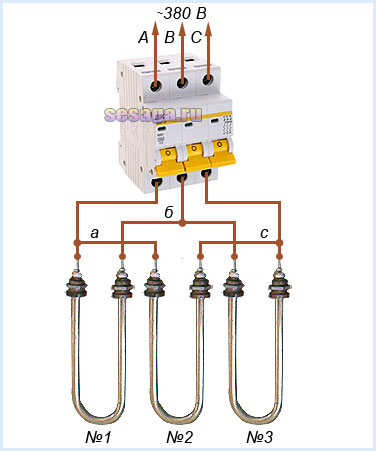 Трехпроводное подключение предназначено для рабочего напряжения 380 Вольт. Ниже рассмотрим схему подсоединения трубчатого нагревателя к трехфазной сети. Включение и отключение напряжения производится в указанном случае автоматически за счет трехполюсных выключателей.
