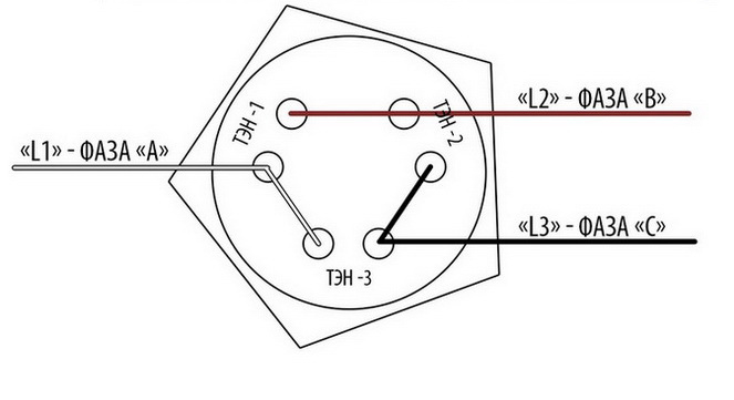 Каждый второй вывод нагревательного элемента подключается к соответствующей фазе. Первые выводы при этом соединены вместе и образовывают общую точку определяющуюся как нулевая или нейтральная. Соединённая нагрузка в данном случае считается трехпроводной.