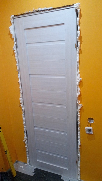 Единственное, что хочу добавить в заключение, не пренебрегайте установкой клиньев, так как даже профессиональная пена в последнее время (во всяком случае, мне такая попадалась) не только расширяется, задавливая коробку в сторону полотна двери, но и на последнем моменте застывания начинает сжиматься, вытягивая за собой коробку в сторону дверного проема.