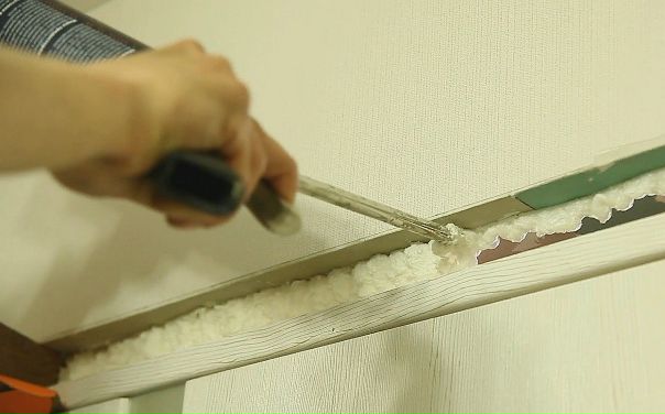Внимание. Лучше применить монтажную пену под пистолет. Она подается дозировано, имеет малый показатель расширения, быстро твердеет. Чтобы не повредить пеной закрепленный короб, перед работой закрывают поверхность пленкой, скотчем, материалом, который быстро отстает от поверхности, не повреждая ее.