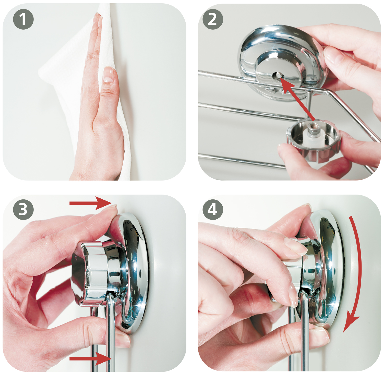 Важно, чтобы поверхность была полностью избавлена от пыли, грязи, налета, ржавчины, жира, мыла и т.д. После всех манипуляций присоску можно крепко прижать к плитке – этого достаточно, чтобы она крепко прикрепилась в поверхности.