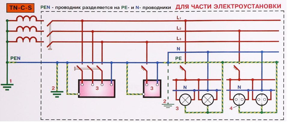 В этом пункте четко прописано, что все электрические установки напряжением от 220 В до 380 В обязаны обладать системой заземления TN-S либо TN-C-S, а так как TN-S практически не используется в России, то остается TN-C-S. И именно в этом варианте требуется расщепление PEN проводника.