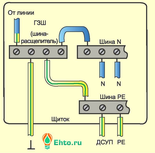 В качестве перемычки может служить любой провод или шинка такого же сечения и материала . Шины или зажимы должны иметь отдельные точки подключения для соответствующих проводников РЕ и N, а не подключаться в одном месте под один болт или зажим