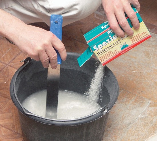Клей Метилан при разведении высыпается в эмалированную посуду. Для получения нужной консистенции необходимо добавлять соответствующее количество воды по инструкции, при этом постоянно перемешивая смесь, как показано на фото.