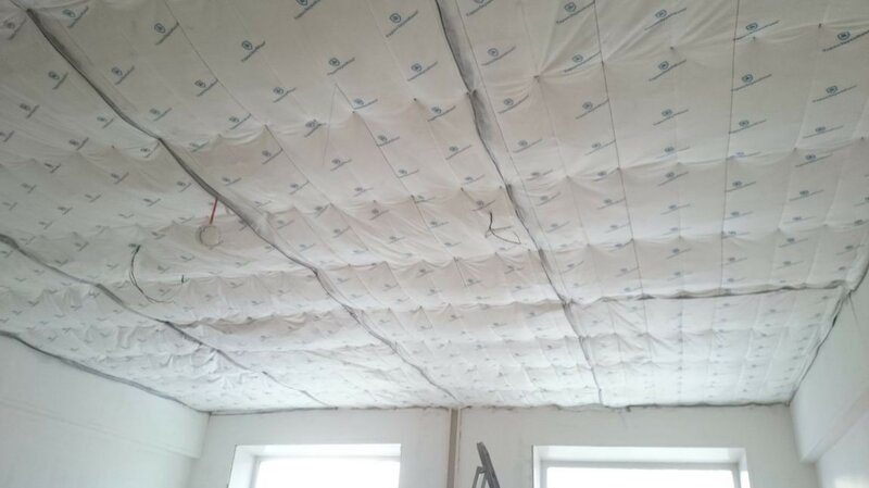 Следующий этап — найти рабочих, согласных «пригвоздить» звукоизоляцию к потолку — не потребовал много времени. А вот непосредственно работа двух человек в 18-метровой комнате растянулась почти на целый день. Насколько я помню, крепили не менее пяти «зонтиков» на одну плиту. Было много шума и пыли. Но, к счастью, сам материал, хоть и казался на ощупь довольно мягким, на куски не разваливался и по квартире не летал. Затем пришли еще одни ребята и сделали натяжной потолок.
