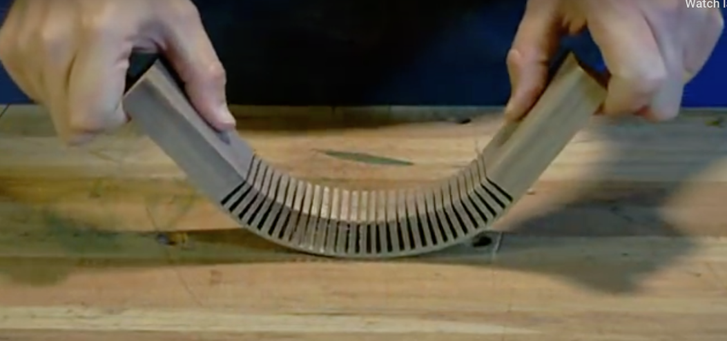 Придаем заготовке нужный радиус с помощью шаблона или формы и наклеиваем шпон со стороны надрезов. Не всегда есть возможность достать шпон, поэтому в домашних условиях можно просто залить клей в щели и оставить до полного высыхания. Затем начисто обработать поверхность.