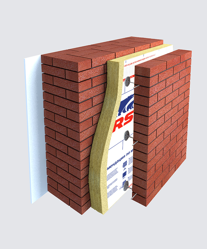 Если в дальнейшем предусматриваться облицовка при помощи кирпича, термоизоляция укладывается между основной и облицовочной стеной, с использование определенных связок, которые будут удерживать минеральную вату.