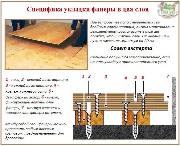 Не стоит укладывать фанеру на лаги или бруски, которые формируют каркас. Древесные плиты под весом фанеры могут попросту переломаться.