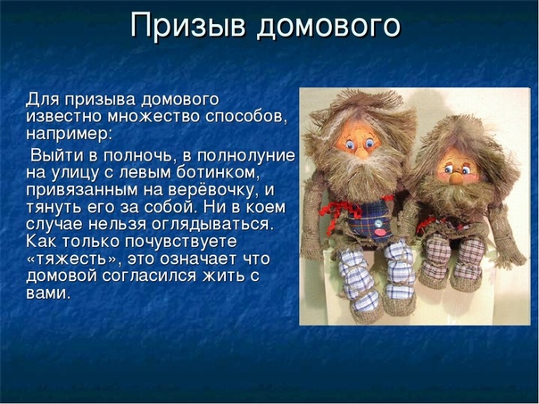 В таком случае, чтобы позвать домовика хозяину дома придется возвратиться на руины старого дома, взяв с собой старую обувь. Обойти остатки старого дома вместе с ботинками три раза. Если все будет верно сделано, то ботинки в руках хозяина значительно потяжелеют. Это означает, что домовой уже готов к тому, чтобы попасть в новое жилище.