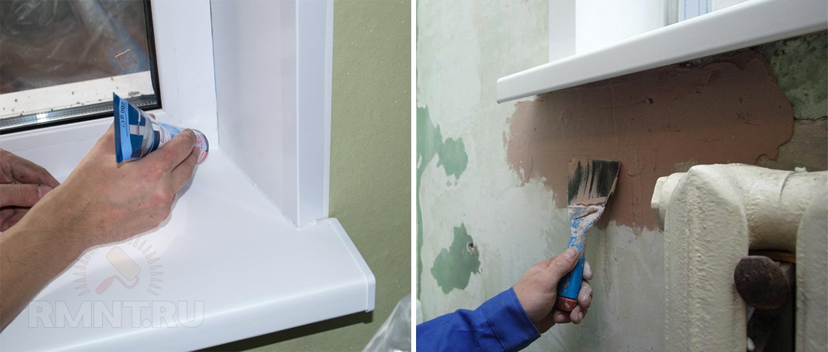 Для защиты от загрязнения и сбитых элементов, окно и подоконник защищаются бумагой или полиэтиленом. А также не помешает защита ручки окна и батареи под подоконником.