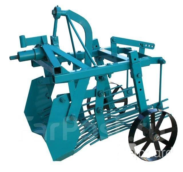 Картофельная копалка на тракторили мотоблок представляет собой навесное устройство, которое крепится на мотоблок или мини-трактор. Картофелекопалки имеют зубцы, которые во время движения вскапывают землю. В процессе движения по транспортеру, между зубцов агрегата остаются картофелины. Клубни автоматически либо помещаются в специальный резервуар, либо выбрасываются в междурядье. Устройство само выкапывает и очищает от земли урожай, его остается только собрать с поверхности земли.