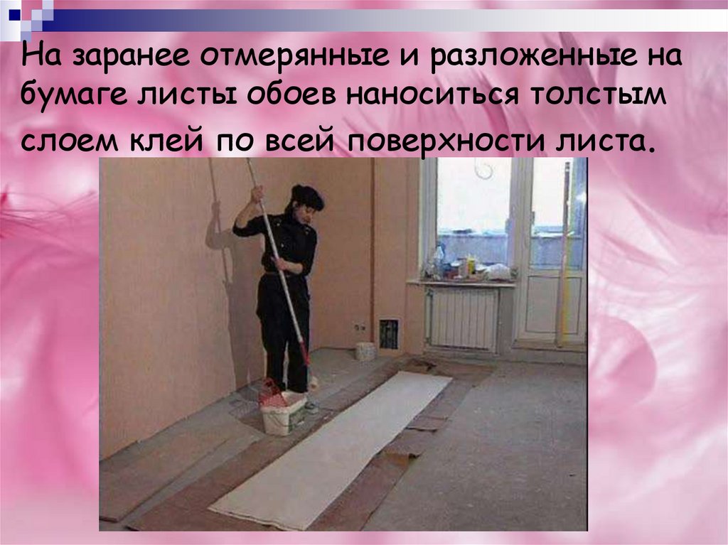 - Намазанное клеем полотно следует выдержать несколько минут. После поклейку обоев.