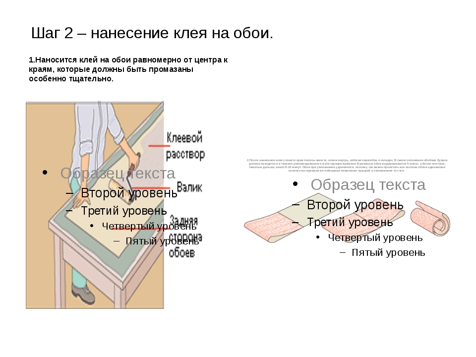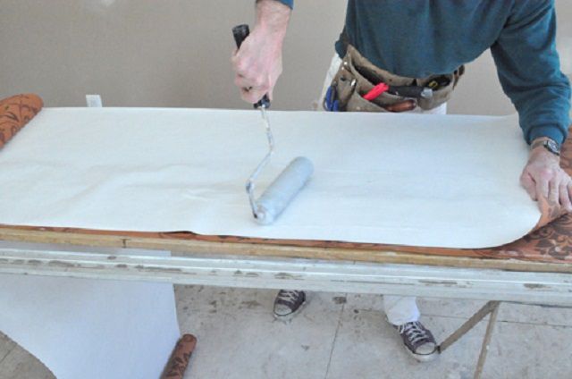 Их необходимо промазать клеем и свернуть особым образом для пропитывания.Затем нанести клей на стену, куда планируется монтировать бумажное полотно. Некоторые производители не нуждаются в такой процедуре, в этой инструкции есть отметка.