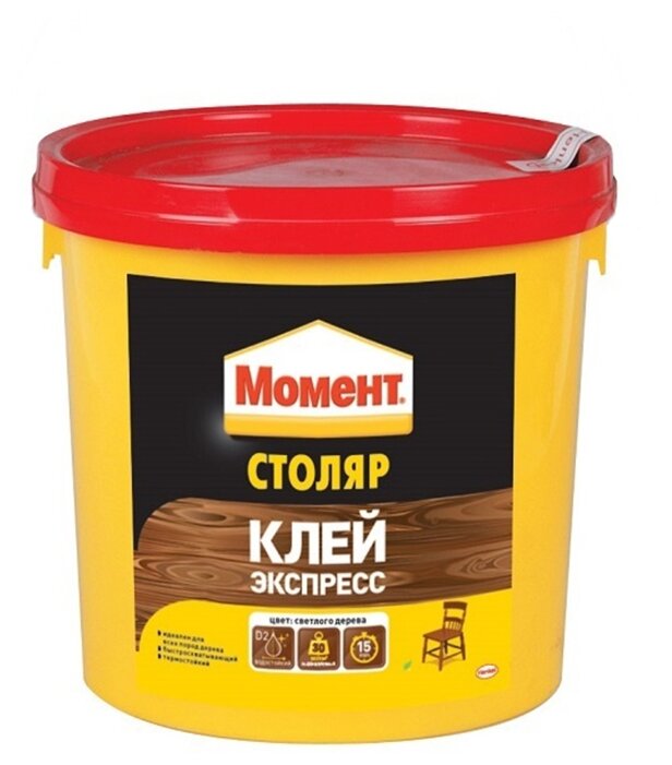 «Момент Столяр Клей-экспресс» – универсальное влагостойкое средство, выпускаемое на водно-дисперсионной основе и предназначенное для склеивания древесины разных пород, а также древесно-волокнистых и древесно-стружечных плит, шпонированных изделий и фанеры. Время полного схватывания составляет от 10 до 15 минут и зависит от температуры окружающей среды и влажности дерева.