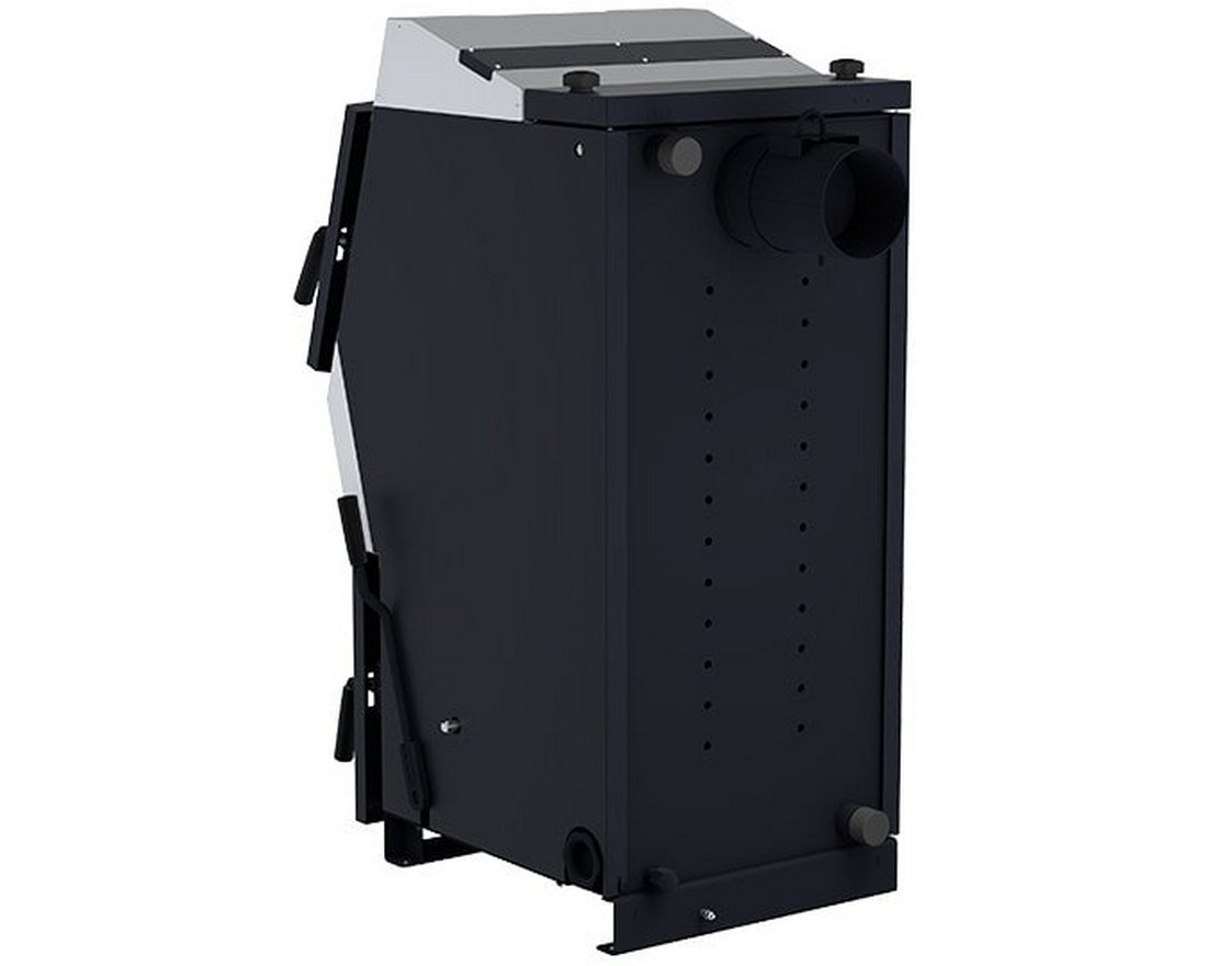 Угольный ящик надежно закрывается двумя зажимами и пыль не просыпается наружу. Мощность котла 63 кВт позволяет отапливать с его помощью здание с площадью до 630 м². Вводить данные и контролировать показания можно при помощи дисплея с сенсорными кнопками. Но у отопителя нет собственного насоса, поэтому его придется купить отдельно.