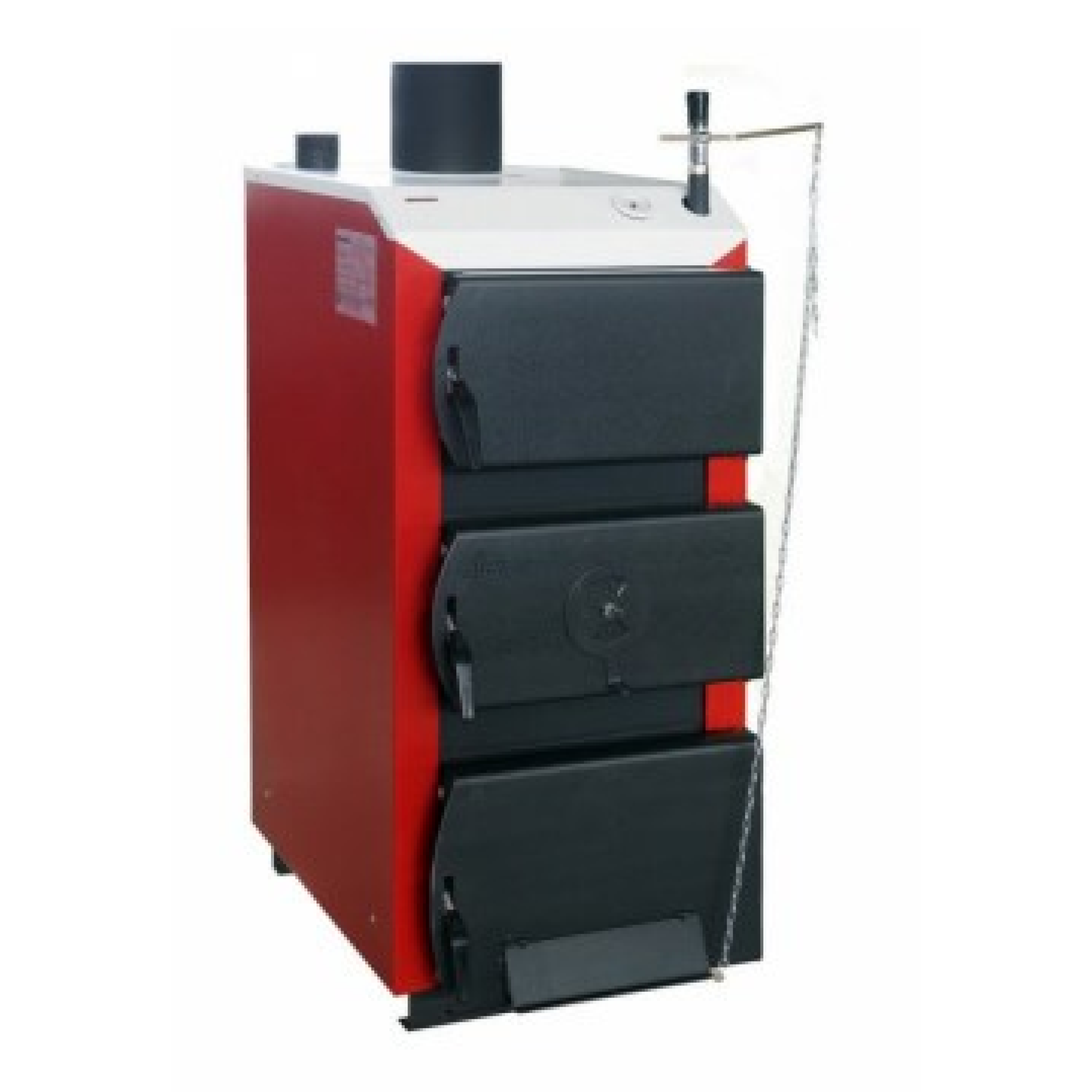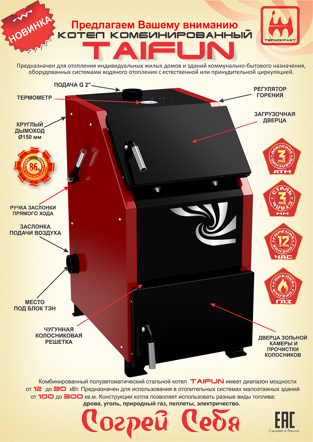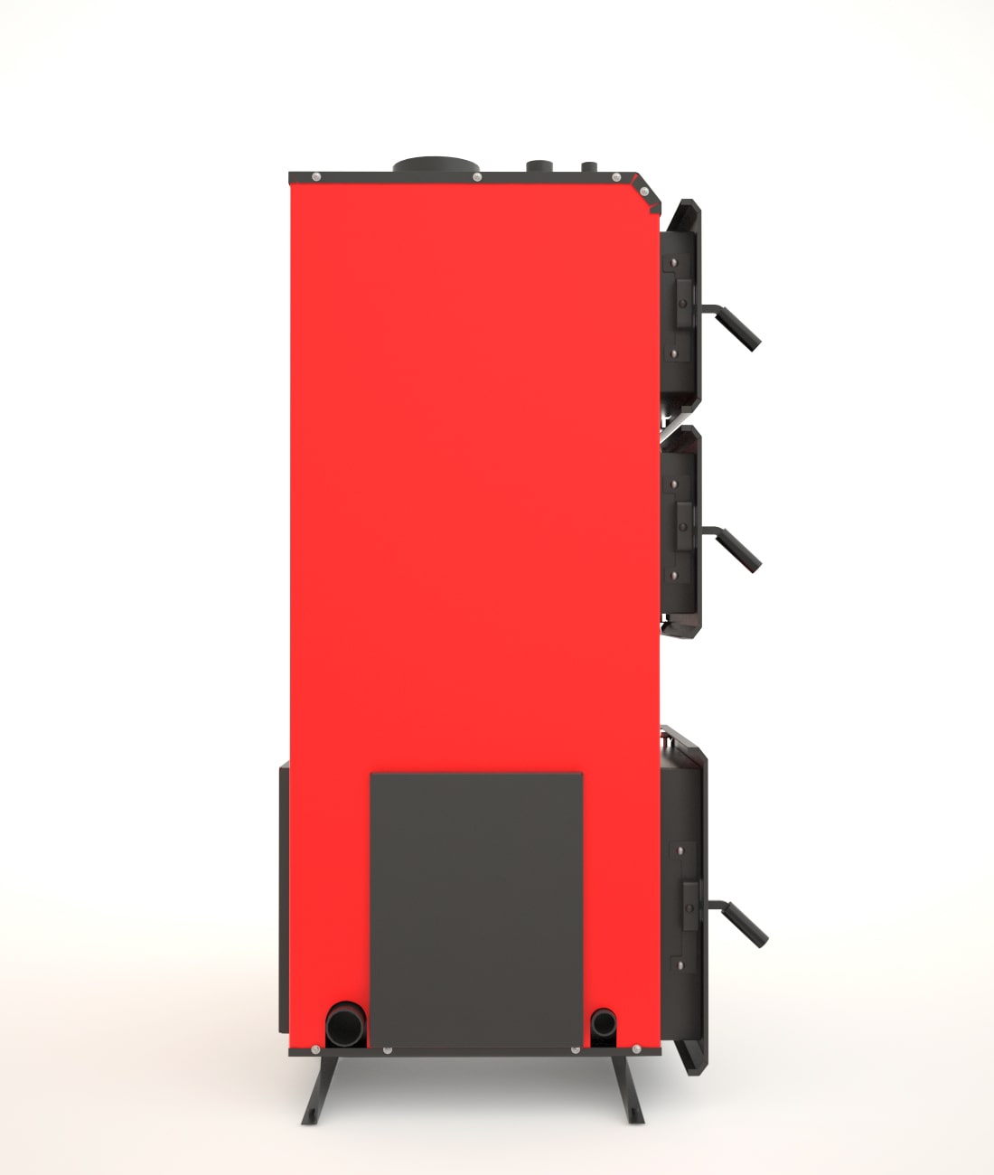 Котел для напольного размещения имеет две камеры (первая для засыпки дров или угля и вторая для первичной подачи воздуха), а также вместительное поддувало, чтобы собирать золу как можно реже. Это обеспечивает длительное горение без вмешательства человека и удобно для эксплуатации на производстве, чтобы не нанимать отдельно истопника. В твердотопливном агрегате предусмотрены манометр и термометр для контроля ключевых показателей. Устройство нагнетает давление до 3 бар, поэтому теплоноситель быстро циркулирует по системе. Его можно нагреть до 95 градусов или поддерживать отопление на минимуме в 50º С, чтобы экономить топливо.