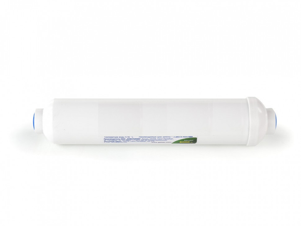 - Для удаления остаточного хлора часто имеется угольная пост-фильтрация – небольшой линейный фильтр, заполненный активированным углем, через который проходит пермеат. Его задача — поймать остатки растворенного хлора и прошедшей через мембрану органики. Поскольку вода после нормально работающей мембраны содержит мало негативных примесей, то и нагрузка на постфильтр невысока, а потому менять его нужно реже.