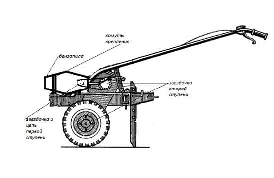 Как видно по схеме, устройство мотоблока Урал довольно понятное, также как и принцип работы. Крутящий момент передается посредством дискового сцепления на коробку передач, которая использует реверс и приводит общий механизм в действие.