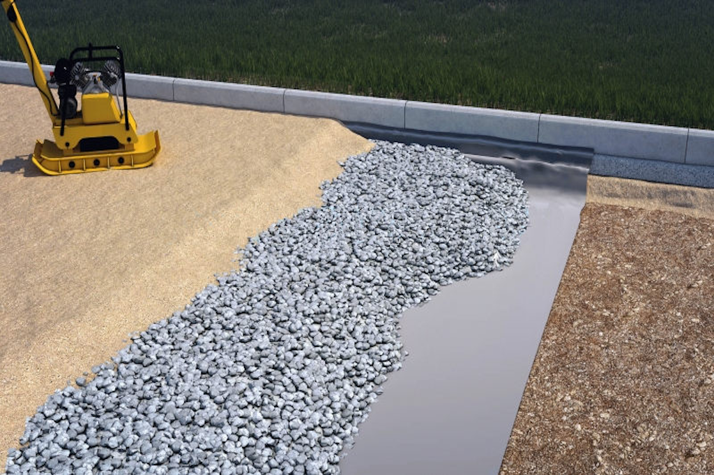 - Для новой асфальтовой или бетонной подъездной дороги, установленной там, где ее не было, — слой утрамбованного гравия глубиной от 8 до 10 дюймов из 3/4-минус гравия (камень больше 3/4 дюйма). Если почва нестабильна, под гравием может потребоваться сетчатая геотекстильная ткань, а также дренажная плитка — 4 дюйма. перфорированная труба, дренирующая периметр проезжей части.