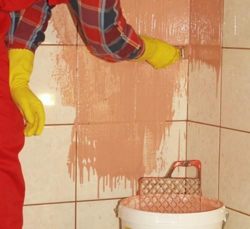 - Старый кафель нужно хорошо отмыть от остатков пыли и жировых загрязнений. Это делается мыльным раствором. Затем, поверхность обезжиривается. После этого, нужно подождать, пока все основательно просохнет.