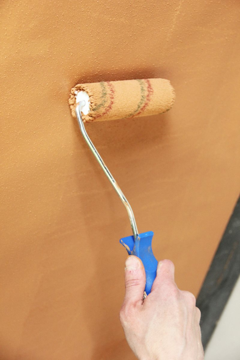 - Если же вы красите в один цвет всю поверхность, то просто берёте валик из овчины и, плотно надавливая, закрашиваете всю плоскость.