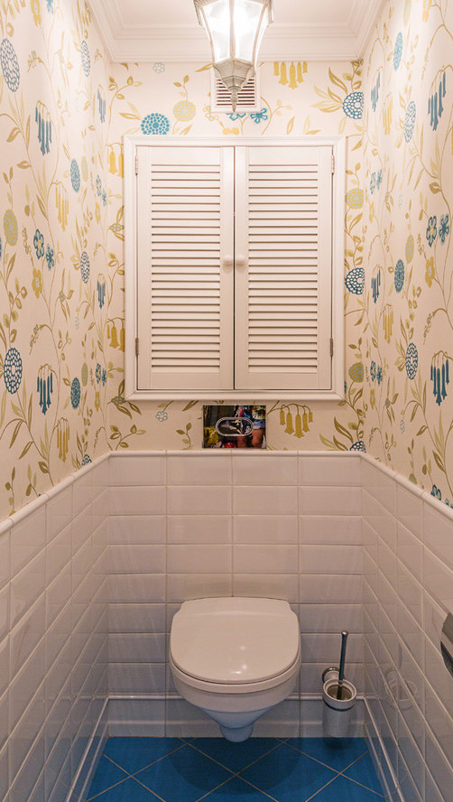 Наиболее частое место в квартире, где можно комбинировать плитку и обои — это ванная комната (пример на фото)